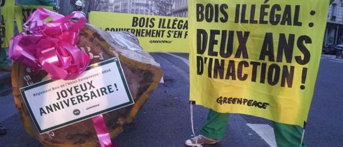 Ακτιβιστές της Greenpeace τοποθέτησαν σήμερα μπροστά από το υπουργείο Οικολογίας στο Παρίσι έναν κορμό δένδρου τροπικού δάσους, βάρους τεσσάρων τόνων, ζητώντας από την κυβέρνηση να "εφαρμόσει το νόμο" κατά των εισαγωγών παράνομης ξυλείας.